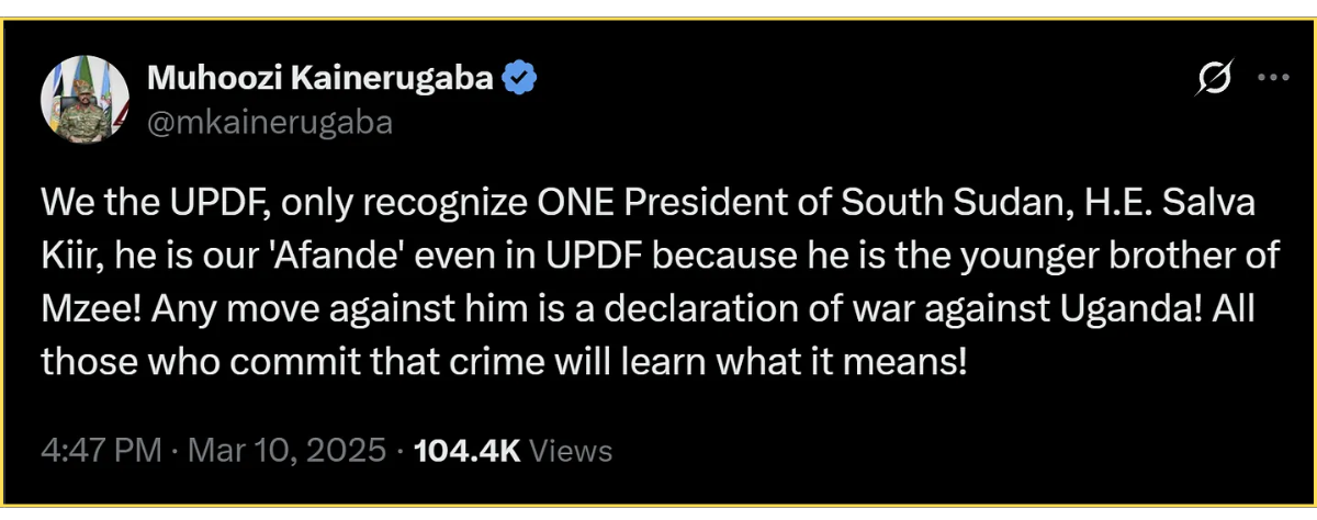 The message wasn’t subtle. Uganda’s military chief, Gen. Muhoozi Kainerugaba, publicly declared that Uganda recognizes only one legitimate authority in South Sudan: President Salva Kiir. Any opposition to him, he said, would be treated as a threat to Uganda’s interests.